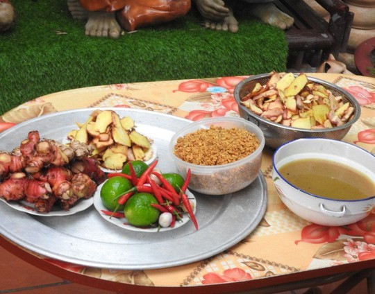 Ngoài lớp giềng lót dưới đáy niêu vừa làm gia vị, vừa giúp cá không bị cháy sau thời gian 20 tiếng kho, thì phủ bên trên những khúc cá to chắc là một hỗn hợp gia vị màu vàng như ở trên hình bao gồm: Gừng, giềng, hành, ớt...giã trộn lẫn với nhau