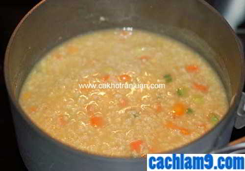 Khi cháo đã chín nhừ, cho toàn bộ phần thịt cá vừa xào vào nồi cháo, đảo đều .