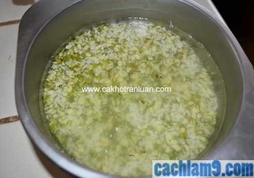 Vo gạo và đậu xanh sau đó cho vào nước luộc cá để ninh cháo ( khi cháo và đậu xanh nhừ mới được)