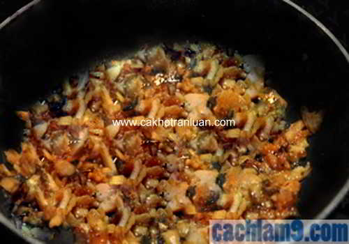 Cho một chút dầu lên chảo, cho dầu sôi lên sau đó cho nghệ, cà rốt, nấm rơm vào đảo, gần chín thì cho thịt cá vào đảo cùng, bạn nhớ nêm gia vị cho thật vừa.